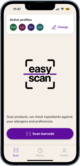 Du kan börja skanna produkter i dina olika matbutiker och få varningar i realtid. EasyScanning hjälper dig att aktivt välja bort produkter som inte uppfyller din egen eller någon annans individuella profil.