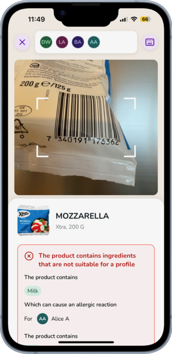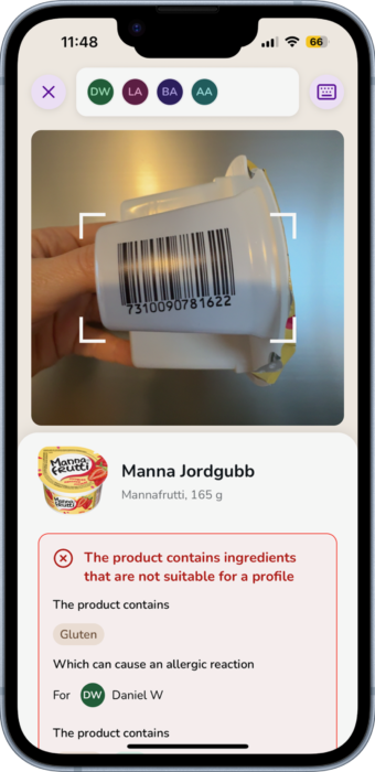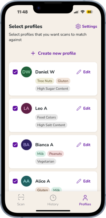 Skapa en extra profil, namnge den och skräddarsy vilka allergener, preferenser och intoleranser som ska undvikas. Spara profilen och börja skanna. Vi kan jämföra en produkt mot flera profiler samtidigt, så att du snabbt ser om den passar alla.